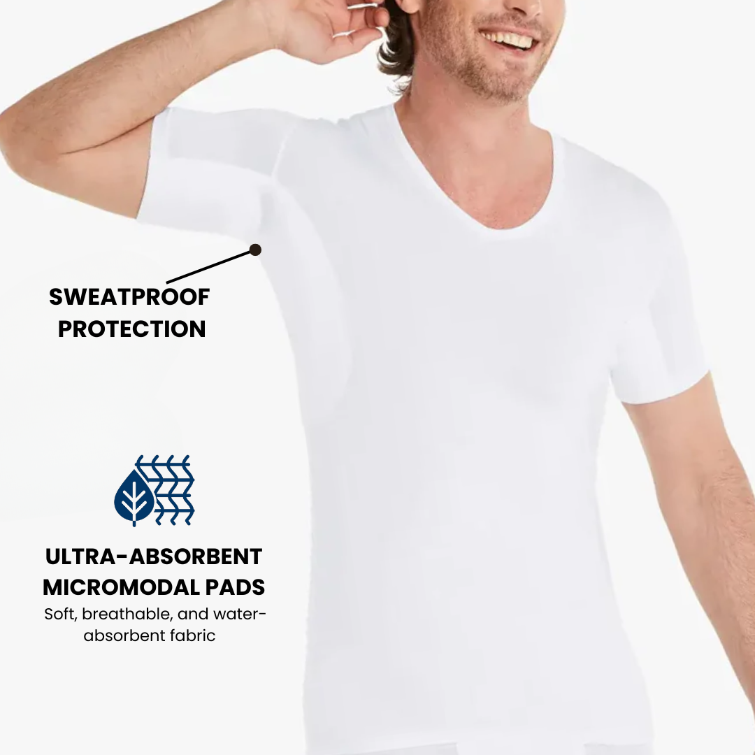 Most sweat-proof undershirts stop at the armpits. BUT 99% of men who sweat under their arms also sweat across their back, which means half the problem is still unsolved.